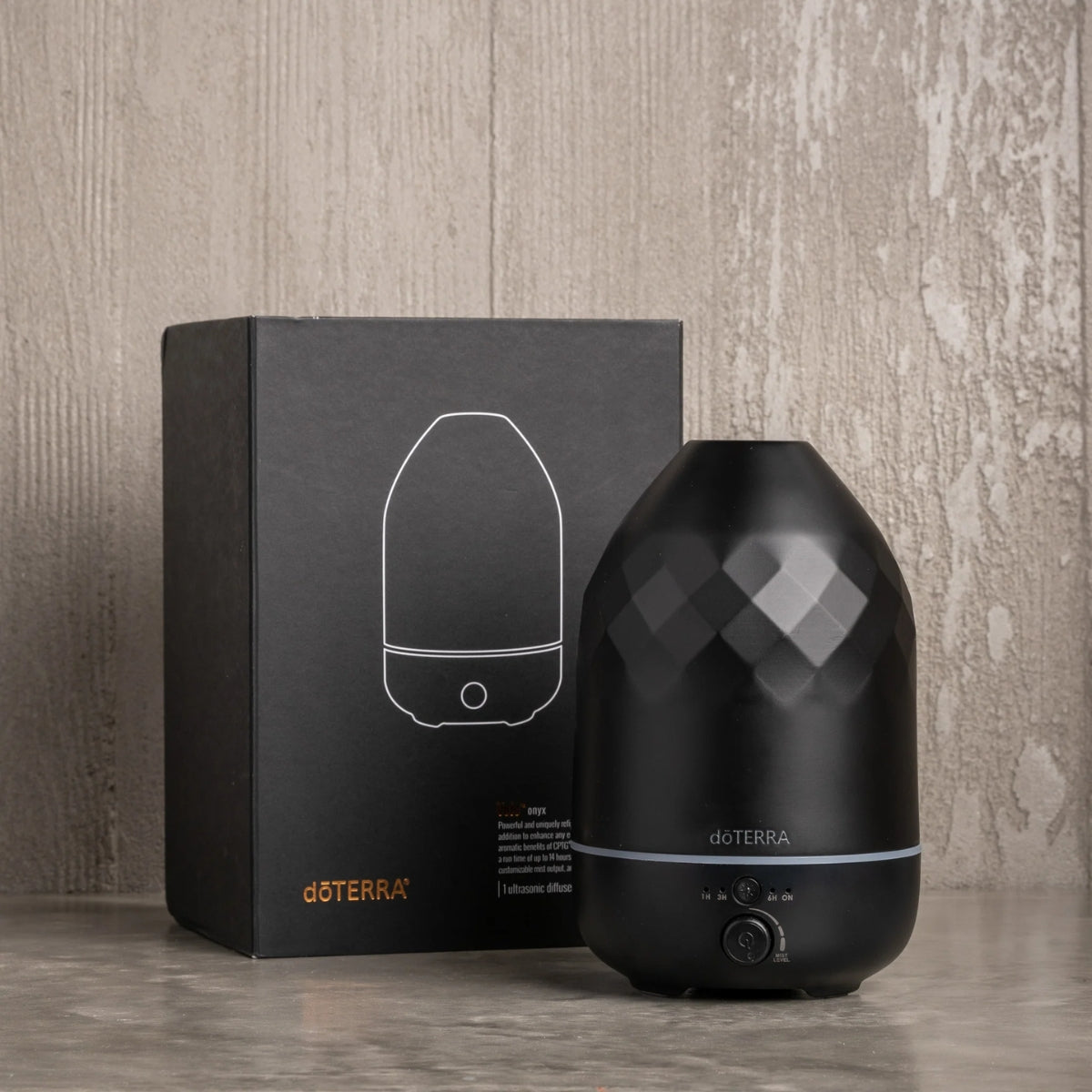 The beautiful dōTERRA Volo Ultrasonic Diffuser comes in onyx and marble finishes, perfect for any room in the home or office. The Volo has a handcraf ted polyresin stone top with a custom diamond pattern and features optional light settings: light-free, warm, and bright amber ambient light settings. This unique diffuser has a customizable output with multiple time settings–one, three, six hours or continuously up to 14 hours--allowing the ability to customize the release of CPTG Certified Pure Therapeutic Grade® essential oils into the air.