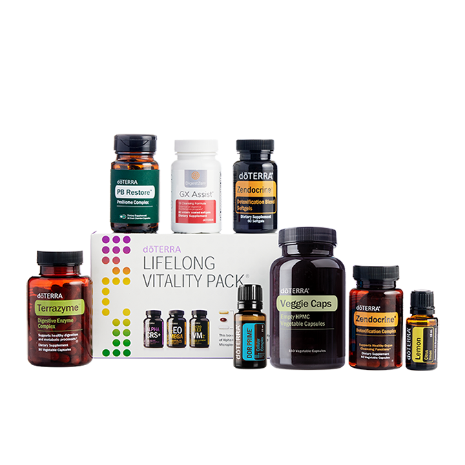 This kit includes the following products:dōTERRA Lifelong Vitality Pack®Zendocrine® SoftgelsZendocrine ComplexDigestZen TerraZyme®GX Assist®PB Assist®+DDR Prime® SoftgelsLemon essential oil